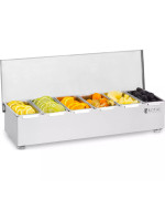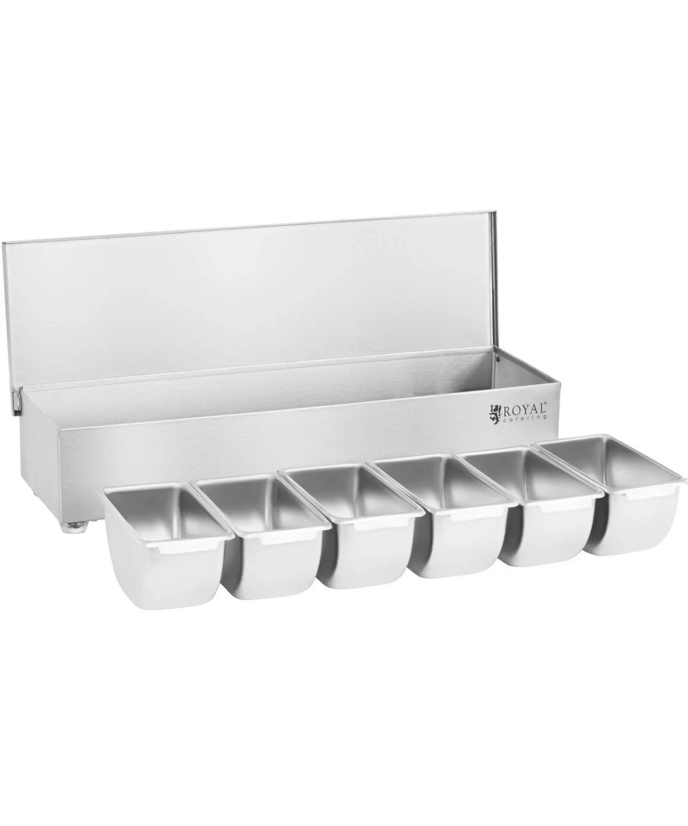 Alle Zutatenbehälter können unabhängig voneinander entnommen und so mit Leichtigkeit befüllt oder entleert werden. Auch die Reinigung der Edelstahl-Behälter gestaltet sich besonders mühelos, da sämtliche Elemente spülmaschinenfest sind. Der Zutatenbehälter RCCBS 6 von Royal Catering ist daher die ideale Ergänzung für Edelstahlmöbel in jeder professionellen Küche!