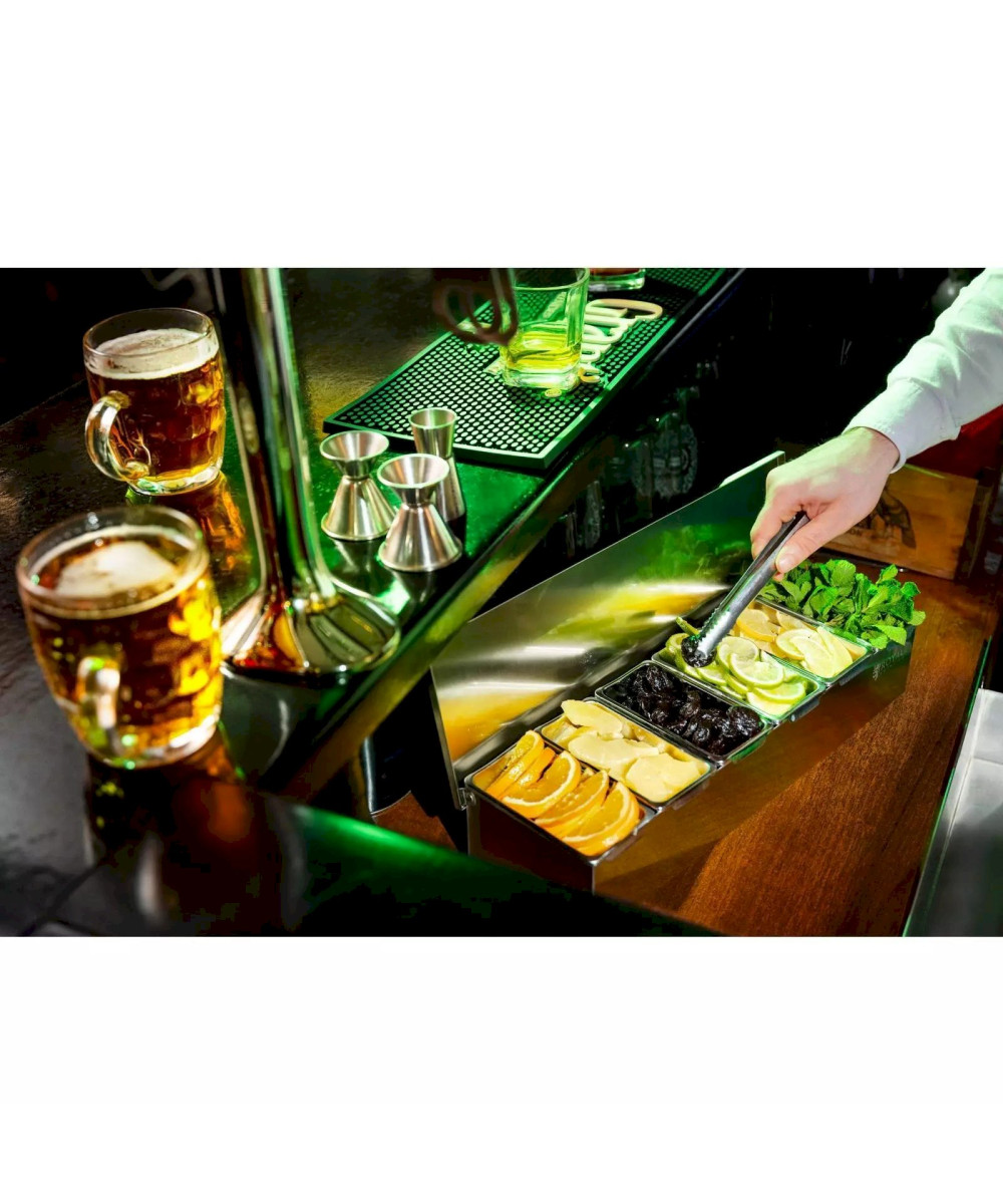 Mit dem Zutatenbehälter erhalten Sie sechs separate Behälter aus Edelstahl, die individuell befüllt und in das Bord eingesetzt werden können. Jeder Behälter kann dabei bis zu 450 ml an Inhalt fassen, sodass Sie insgesamt bis zu 2,7 Liter an Nahrungsmitteln unterbringen können. Vor allem im hektischen Küchenbetrieb dient das Zutatenbehälter Aufsatzbord daher als praktische Organisationshilfe zur Vorbereitung Ihrer Speisekreationen.