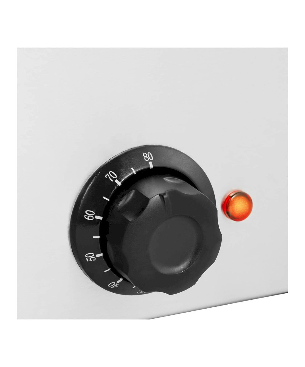 Das effiziente, 600 W leistungsstarke Heizelement erwärmt das Wasser schnell auf die gewünschte Temperatur. Über den Drehregler wird das automatische Thermostat aktiviert, welches eine präzise Temperaturregelung zwischen 30 - 80 °C ermöglicht. Diese Bain Marie verfügt außerdem über einen Ablasshahn, wodurch das Befüllen, Entleeren und Reinigen erleichtert wird.