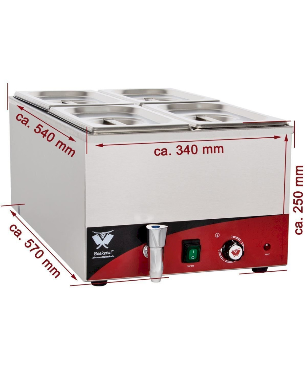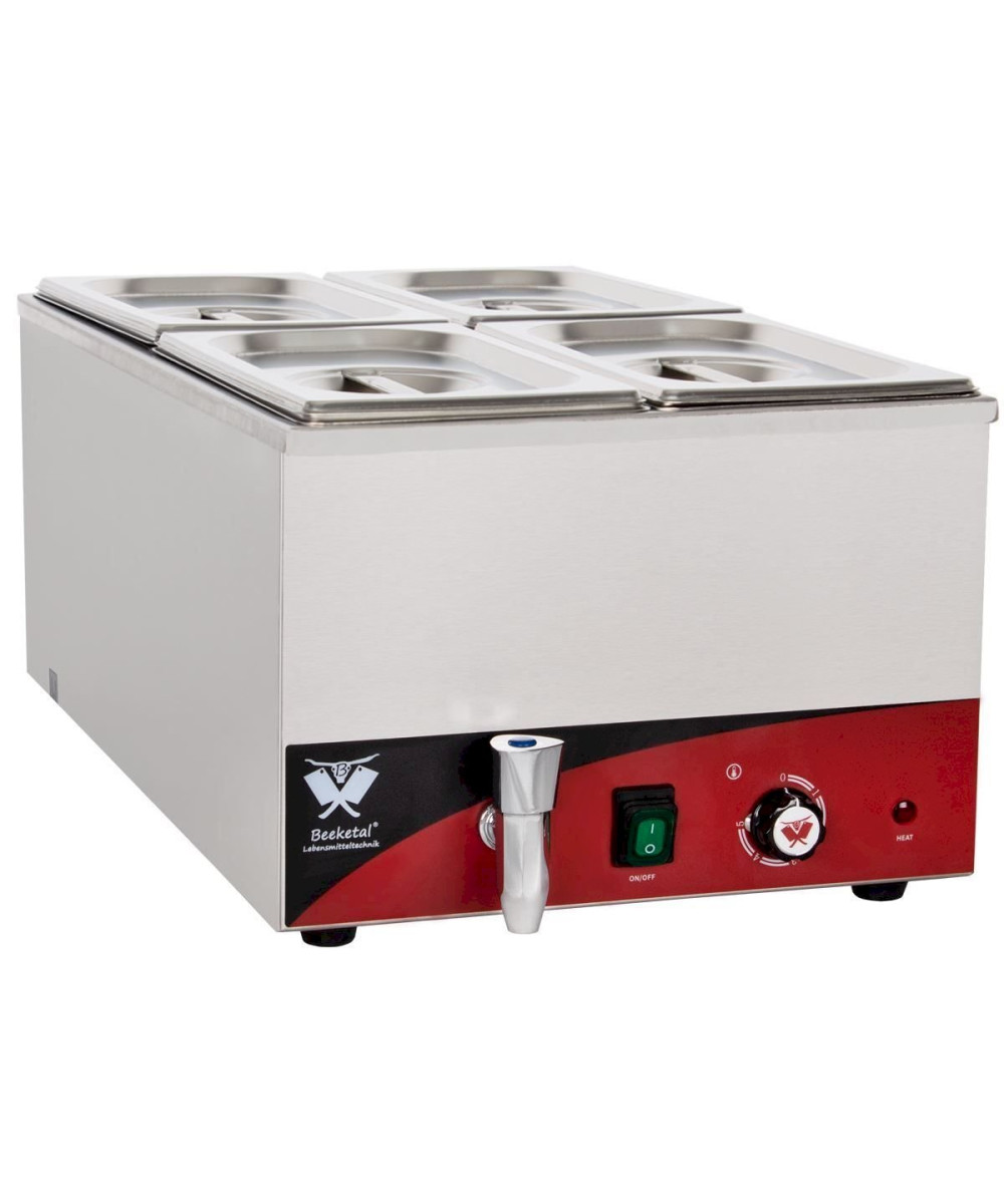 Profi Gastronomie Wasserbad zum Erhitzen und Warmhalten von Speisen aller Art. Speisewärmer im für die Gastronomie typischen Edelstahlgehäuse verfügt über einen Ablasshahn zur leichten Entleerung des Wasserbehälters. Die Temperatur lässt sich genau einstellen (35-65° C). Der große Ablauf mit Siebfunktion und der tiefe Auslauf gewährleisten eine schnelle Entleerung und komfortable Reinigung. Der Beeketal Speisewärmer besticht durch seine einfach jedoch sehr robuste Technik die nahezu unverwüstlich ihre Arbeit verrichtet. Hochwertige und übersichtliche Verarbeitung, stabiler Stand durch das hohe Gewicht und den zuverlässigen Anti-Rutsch Gummifüßen, machen die Beeketal Bain Marie Speisewärmer nahezu unverzichtbar für die anspruchsvolle Profi Gastronomie.