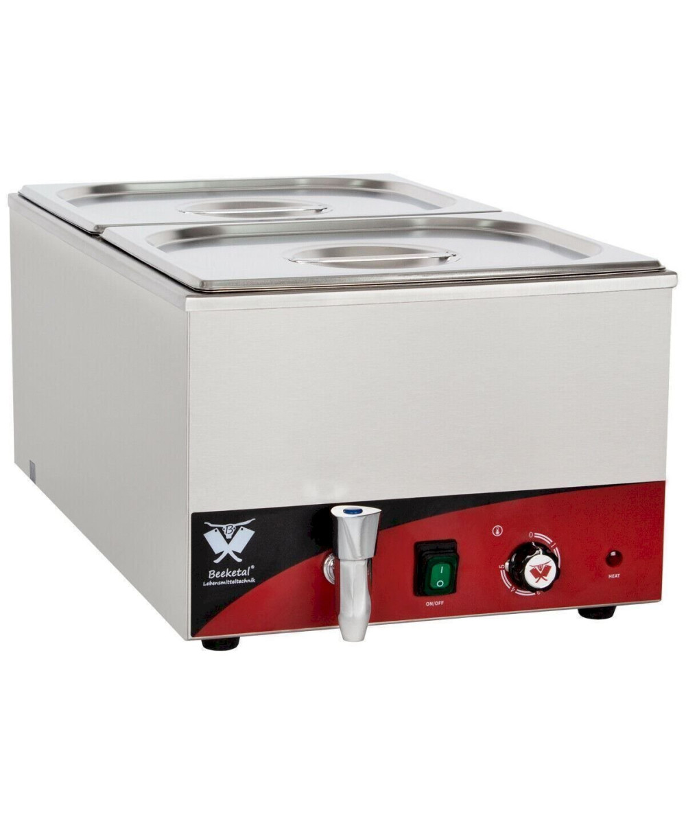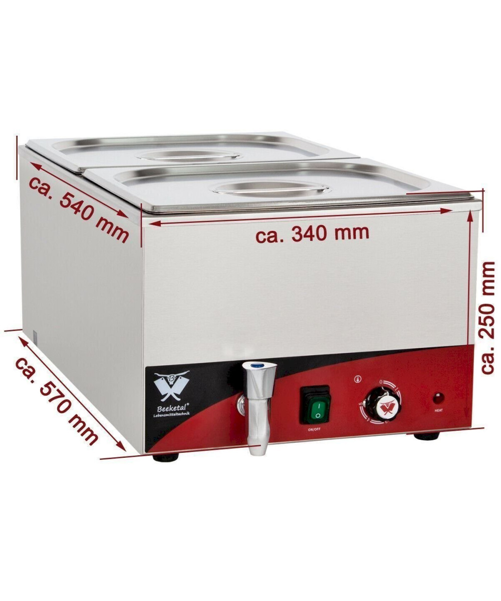 Profi Gastronomie Wasserbad zum Erhitzen und Warmhalten von Speisen aller Art. Speisewärmer im für die Gastronomie typischen Edelstahlgehäuse verfügt über einen Ablasshahn zur leichten Entleerung des Wasserbehälters. Die Temperatur lässt sich genau einstellen (35-65° C). Der große Ablauf mit Siebfunktion und der tiefe Auslauf gewährleisten eine schnelle Entleerung und komfortable Reinigung. Der Beeketal Speisewärmer besticht durch seine einfach jedoch sehr robuste Technik die nahezu unverwüstlich ihre Arbeit verrichtet. Hochwertige und übersichtliche Verarbeitung, stabiler Stand durch das hohe Gewicht und den zuverlässigen Anti-Rutsch Gummifüßen, machen die Beeketal Bain Marie Speisewärmer nahezu unverzichtbar für die anspruchsvolle Profi Gastronomie.