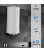 Dieses vielseitige, elektrisch betriebene Haushaltsgerät ist sowohl auf Funktionalität als auch auf Langlebigkeit ausgelegt. Unser Warmwasserspeicher verfügt über einen emaillierten Stahltank mit Anti-Kalk-Beschichtung und Magnesiumanode, um Korrosionsbeständigkeit und eine lange Lebensdauer des Produkts zu gewährleisten. Er ist mit einem einstellbaren Thermostat ausgestattet, mit dem Sie das Wasser bis zu 75 °C erhitzen können, sowie mit einem Sicherheitsventil und allen notwendigen Befestigungsmaterialien. Dieses Anti-Kalk-Modell ist in verschiedenen Fassungsvermögen erhältlich, so dass Sie mit Sicherheit ein Modell finden, das Ihren Warmwasserbedarf entspricht.