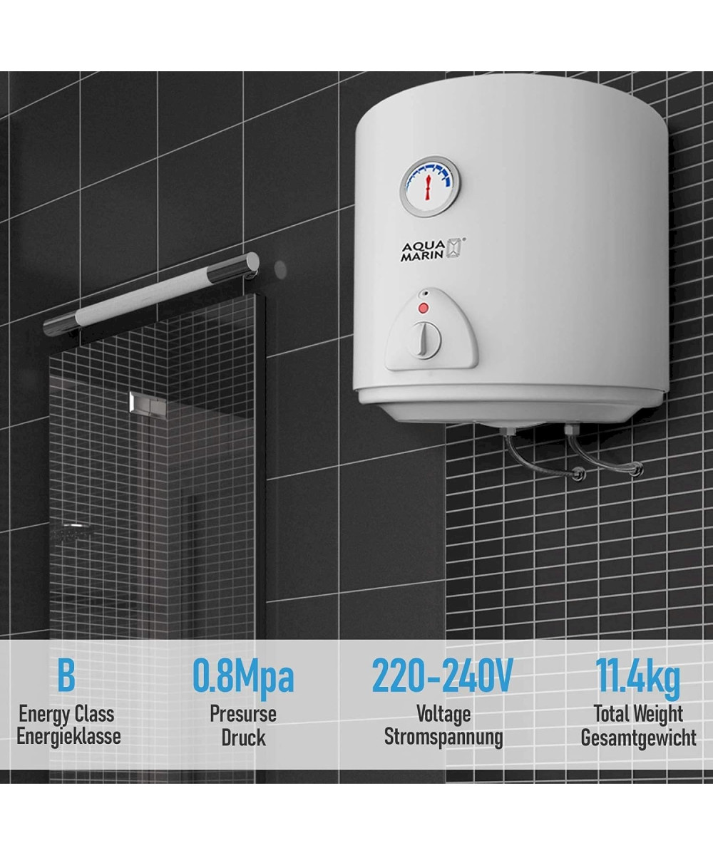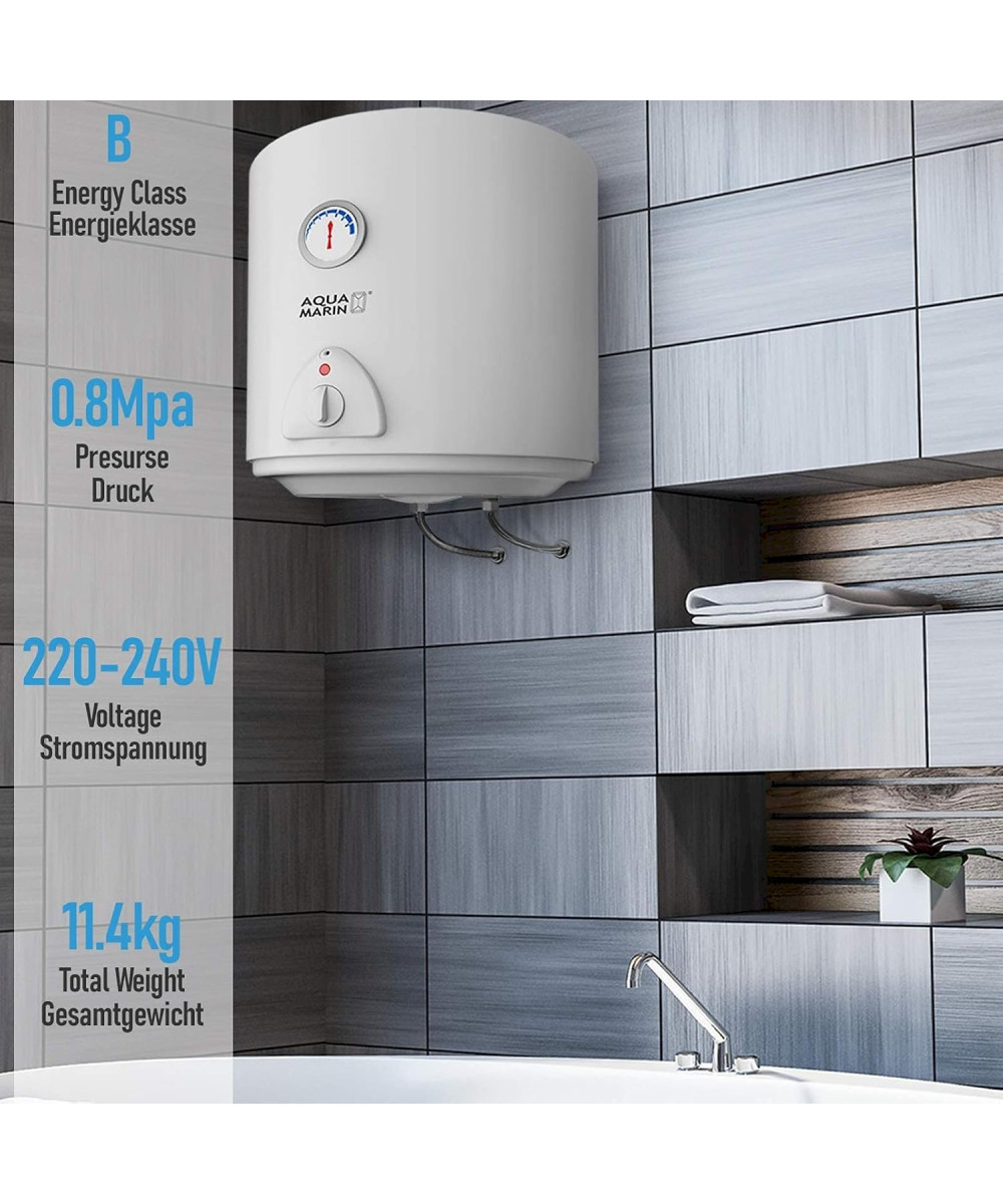 Dieser elektrische Warmwasserspeicher von Aquamarin mit saphirgoldenem Siliziumbehälter ist ideal für Wassererwärmung auf Temperaturen bis zu 75 Grad Celsius. Der Behälter ist korrosionssicher, langanhaltend und mit hoher Effizienz. Der innere Tank hat eine Dicke von 1,8 - 2,0 mm und ist mit 0,5 mm dicken, emaillierten Materialien bedeckt, um den Tank vor Korrosion zu schützen. Der Warmwasserspeicher hat ein Fassungsvermögen von 30 Liter. Mit diesem elektrischen Warmwasserspeicher bleibt die Wassertemperatur bis zu 48 Stunden nach dem Ausschalten stabil.