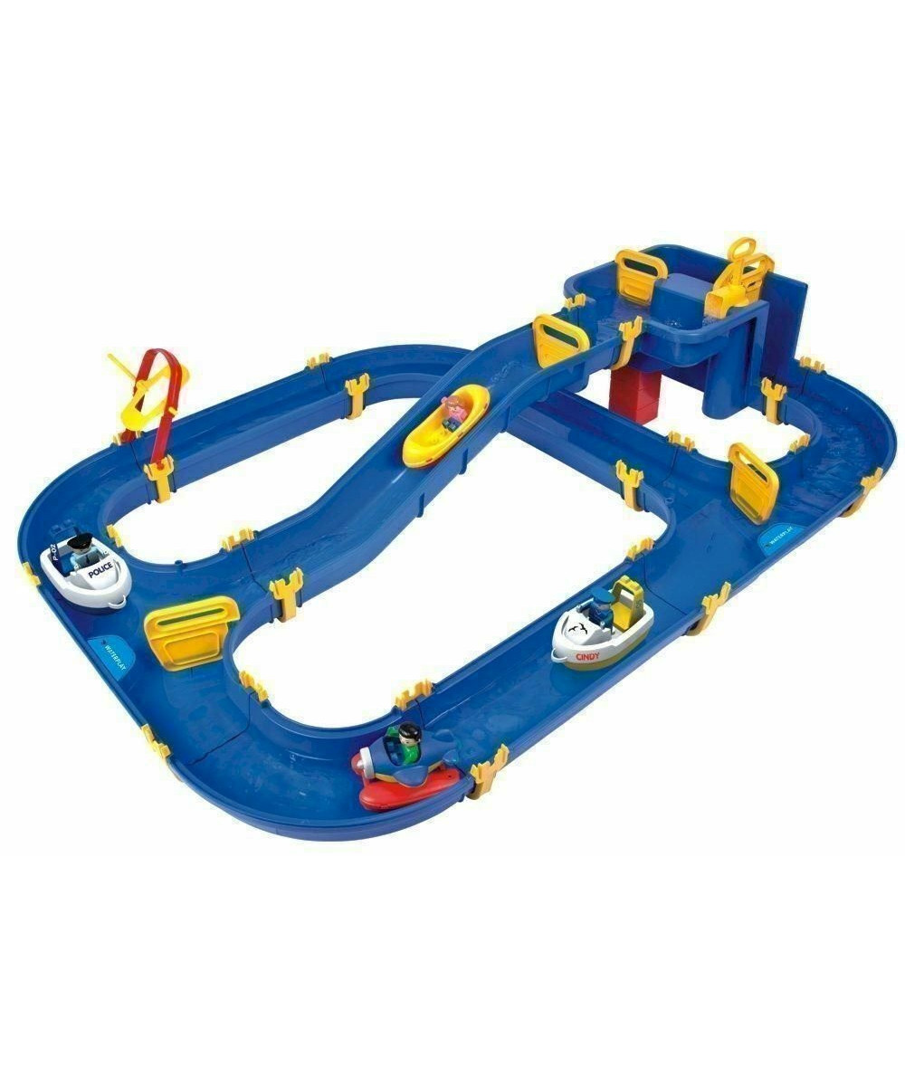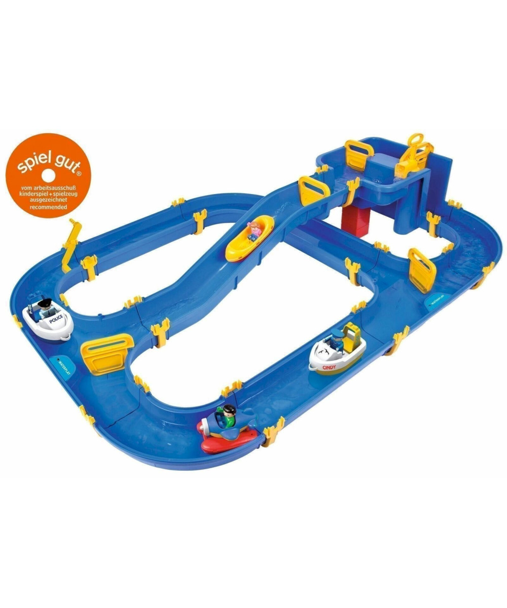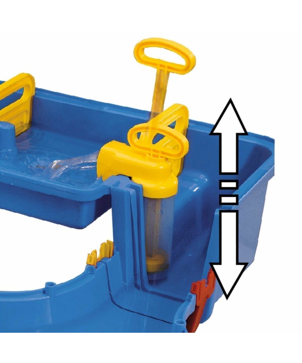BIG WATERPLAY Niagara ist das größte Basisset dieser Reihe und bringt bereits zahlreiche Schleusenteile, ein Wasserrad sowie 4 Wasserfahrzeuge mit. Das Wasser wird mitteils einer bereits enthaltenen Handpumpe herauf gepumpt.