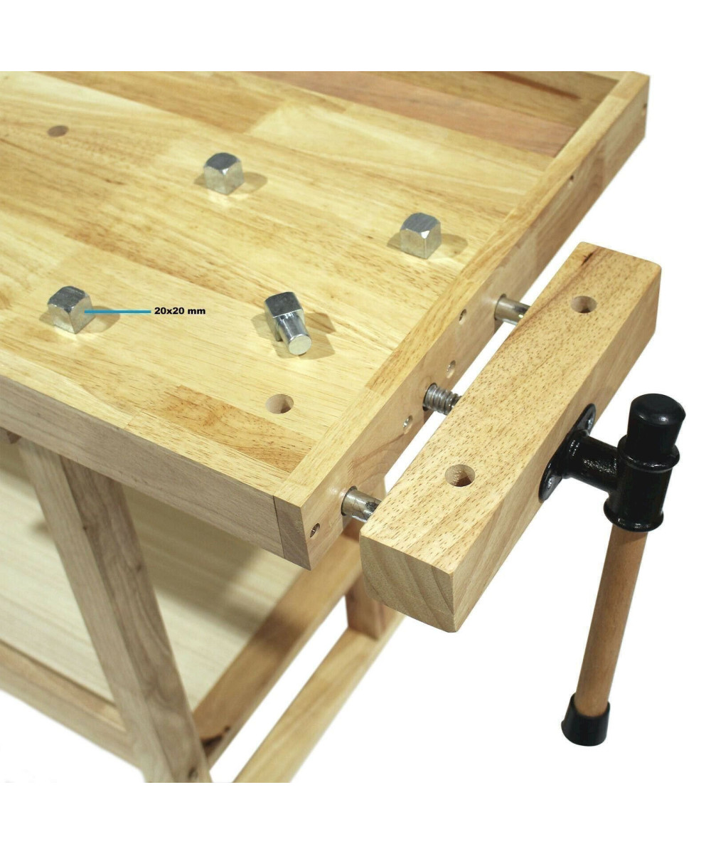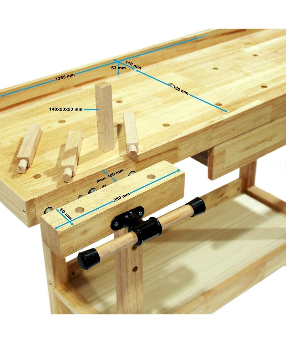 Die Werkbank besteht aus sogenanntem Rubberwood. Dabei handelt es sich um das Holz des Kautschukbaumes, welches sehr hart und extrem stabil ist. Zusätzliche Stabilität liefern die 50 x 50 mm dicken Tischbeine. Damit Sie sowohl kleinere, als auch großräumige Arbeiten durchführen können, verfügt die Werkbank über eine 135,5 x 35,8 cm große Arbeitsfläche mit einer Plattenstärke von 18 mm.