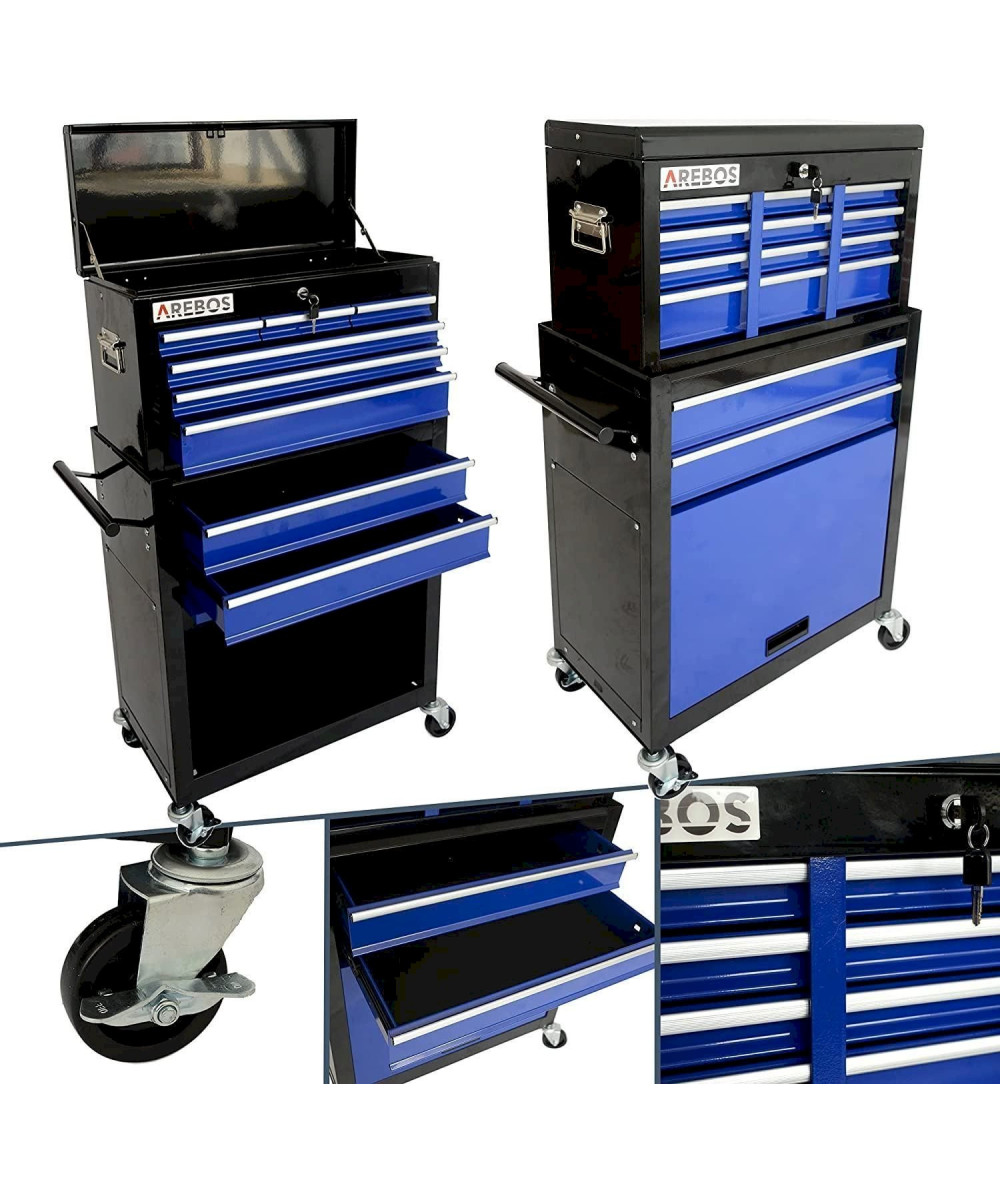 Während der obere Werkzeugkasten über sechs ausziehbare Schubfächer und ein aufklappbares Fach verfügt, sind in dem unteren Werkzeugwagen 2 Schubladen und ein großer Stauraum integriert. Dieser eignet sich optimal, um zum Beispiel großes Elektrowerkzeug wie einen Bohrhammer oder einen Schlagschrauber aufzubewahren. Auch der kleinere Werkzeugkasten lässt sich in diesem ohne Probleme verstauen.
