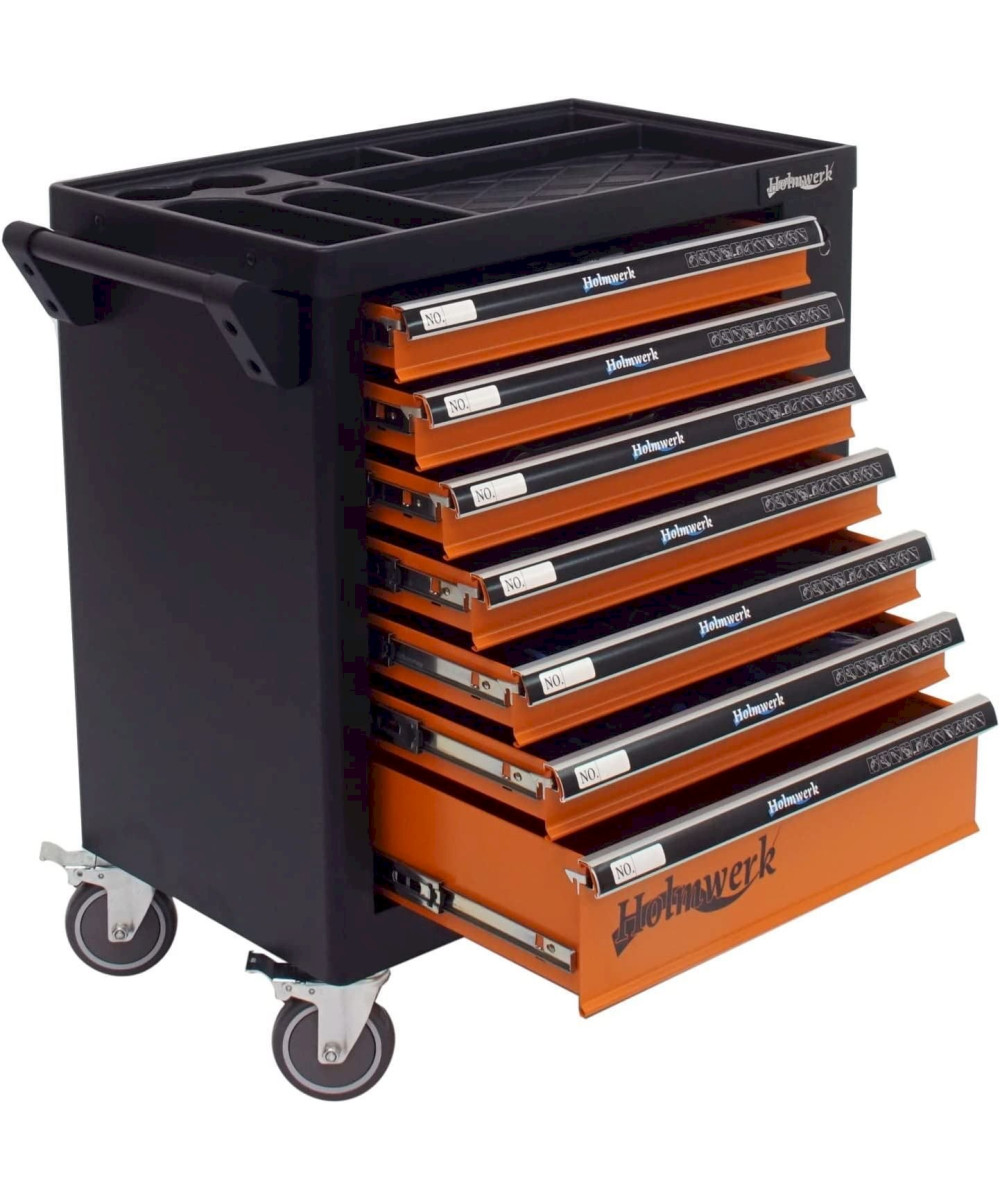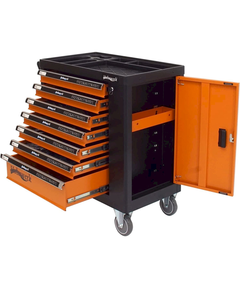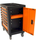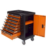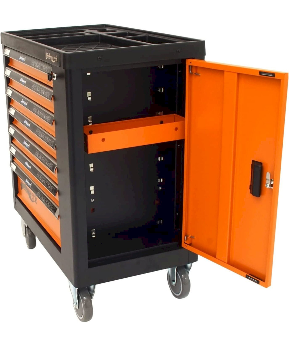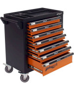 Stahlblech · Feststellbremse · Werkzeugwagen, Montagewagen · Pulverbeschichtet, Abschließbar · Bestückt, Leer · Zentralverriegelung, Zylinderschloss, Vollauszug · Orange, Schwarz · 7 Schubladen · Werkstattwagen · Kunststoff