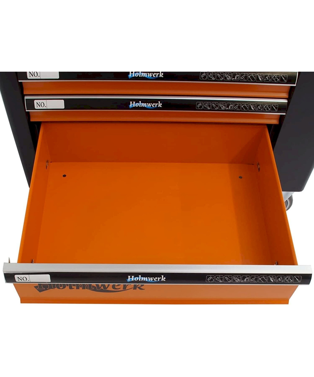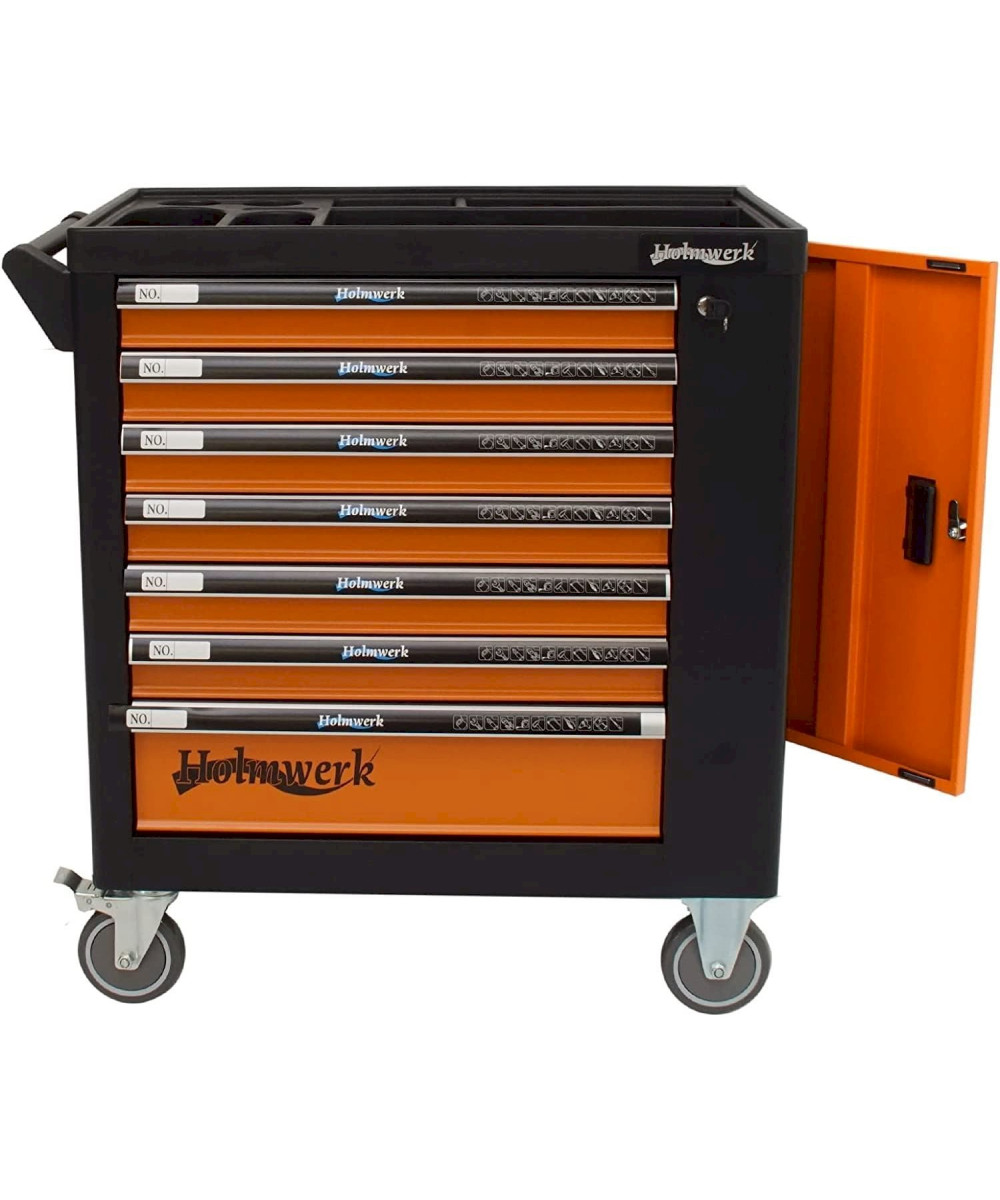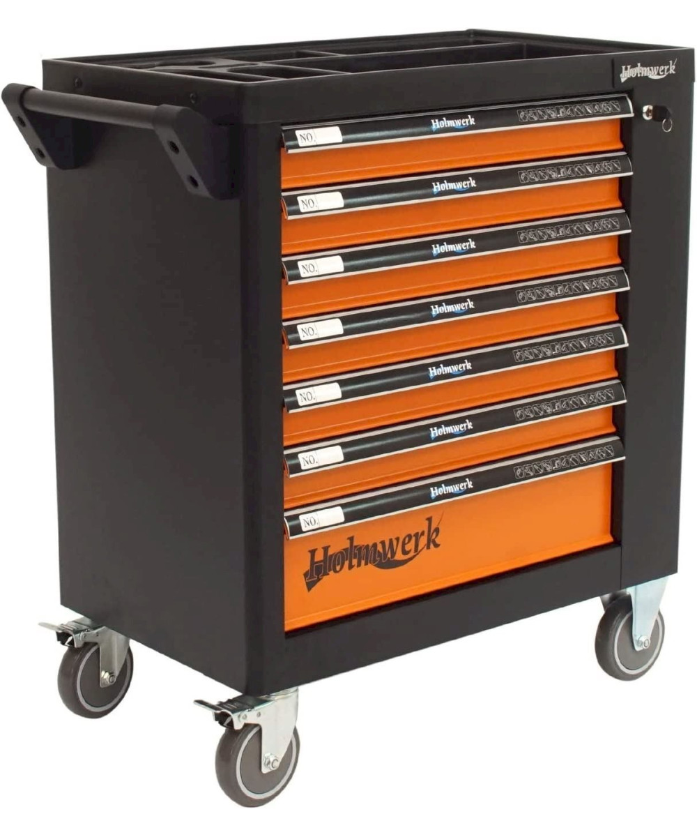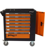 Stahlblech · Feststellbremse · Werkzeugwagen, Montagewagen · Pulverbeschichtet, Abschließbar · Bestückt, Leer · Zentralverriegelung, Zylinderschloss, Vollauszug · Orange, Schwarz · 7 Schubladen · Werkstattwagen · Kunststoff