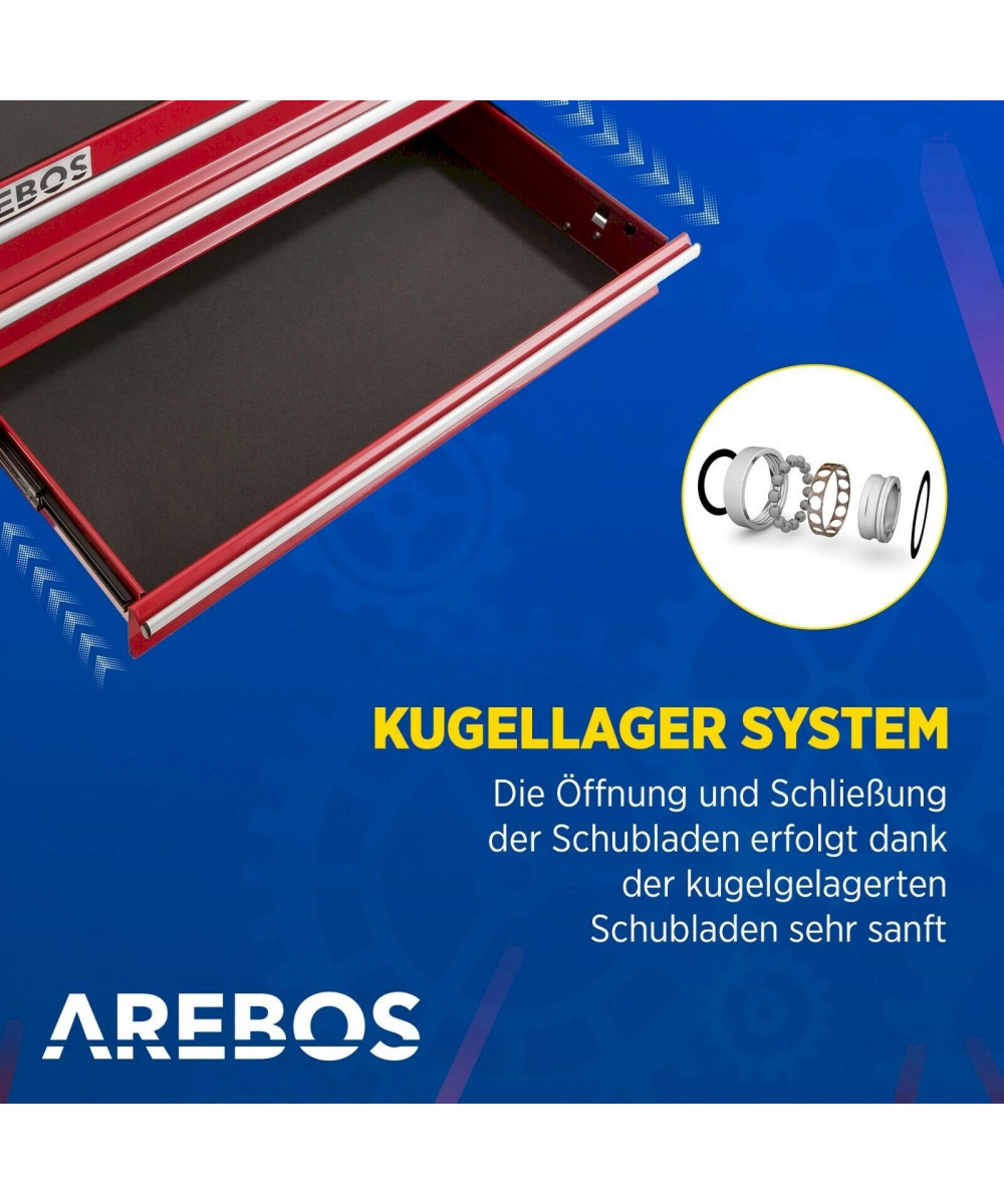 Der AREBOS Werkstattwagen ist aus robustem Stahl gefertigt. In den ausziehbaren Schubladen können Sie Ihr Werkzeug optimal sortieren. Die Öffnung und Schließung erfolgt dank der kugelgelagerten Schubladen sanft. Sie besitzen eine Einrastfunktion, sodass sie sich nicht von selbst öffnen. Antirutschmatten sorgen dafür, dass das Werkzeug an seinem Platz bleibt.