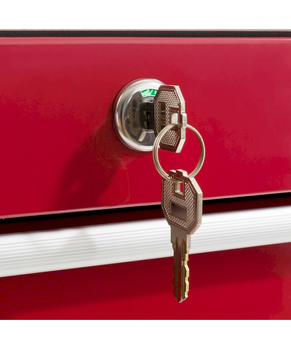 Der Werkstattwagen verfügt über eine Zentragverriegelung, mit dem Sie alle Schubladen gleichzeitig gegen ein versehentliches Öffnen sichern und problemlos transportieren können. Durch das Abschließen der Schubladen ist das Werkzeug im Inneren sicher aufbewahrt und der direkte, unbefugte Zugriff verhindert. - Antirutschmatten & kugelgelagerte Schubladen