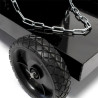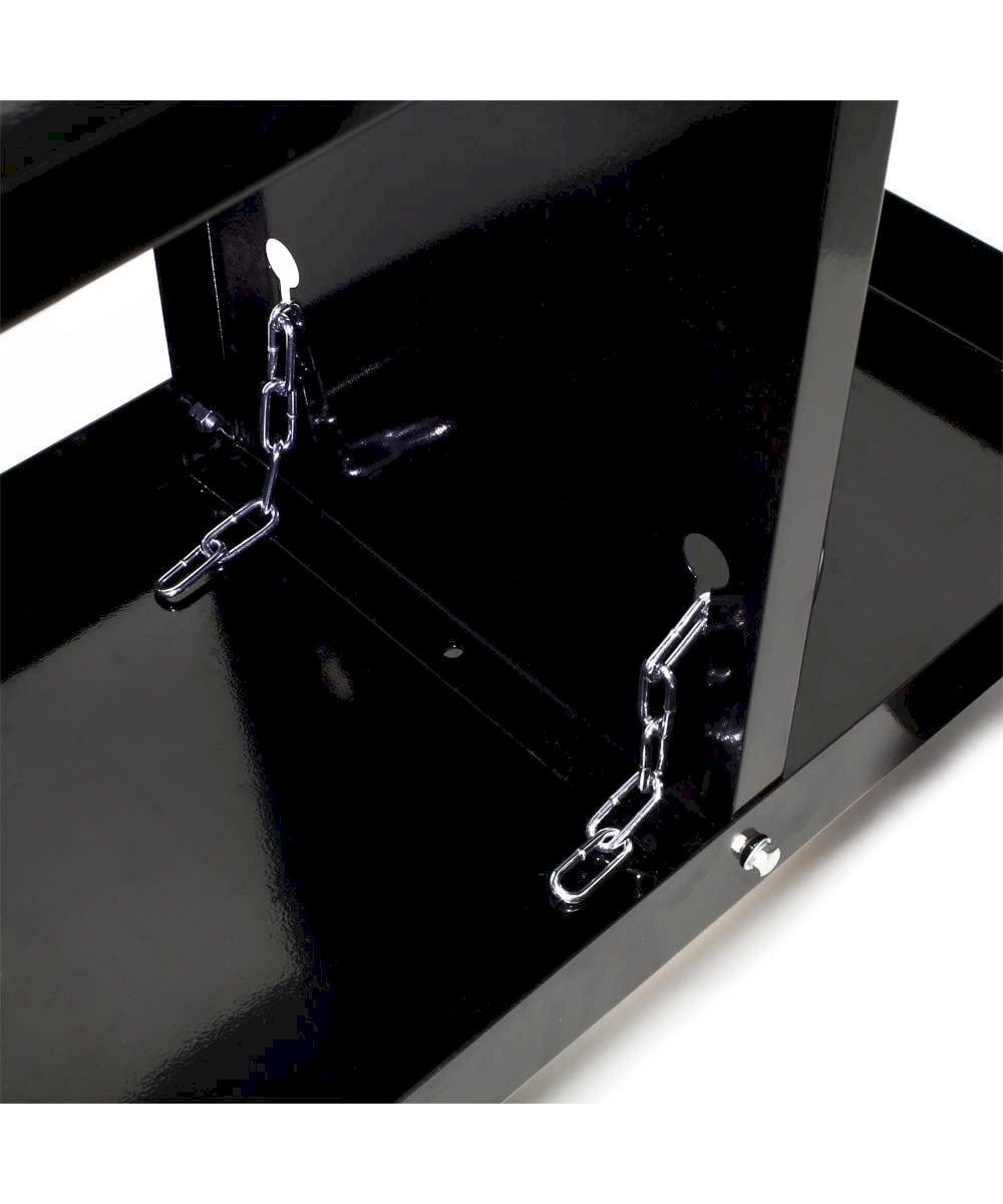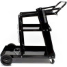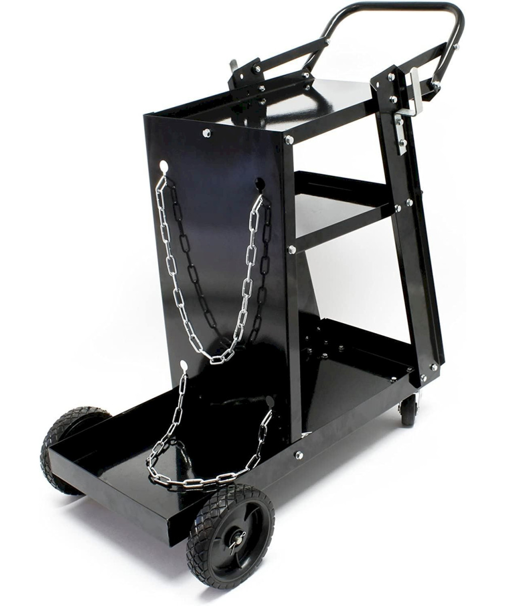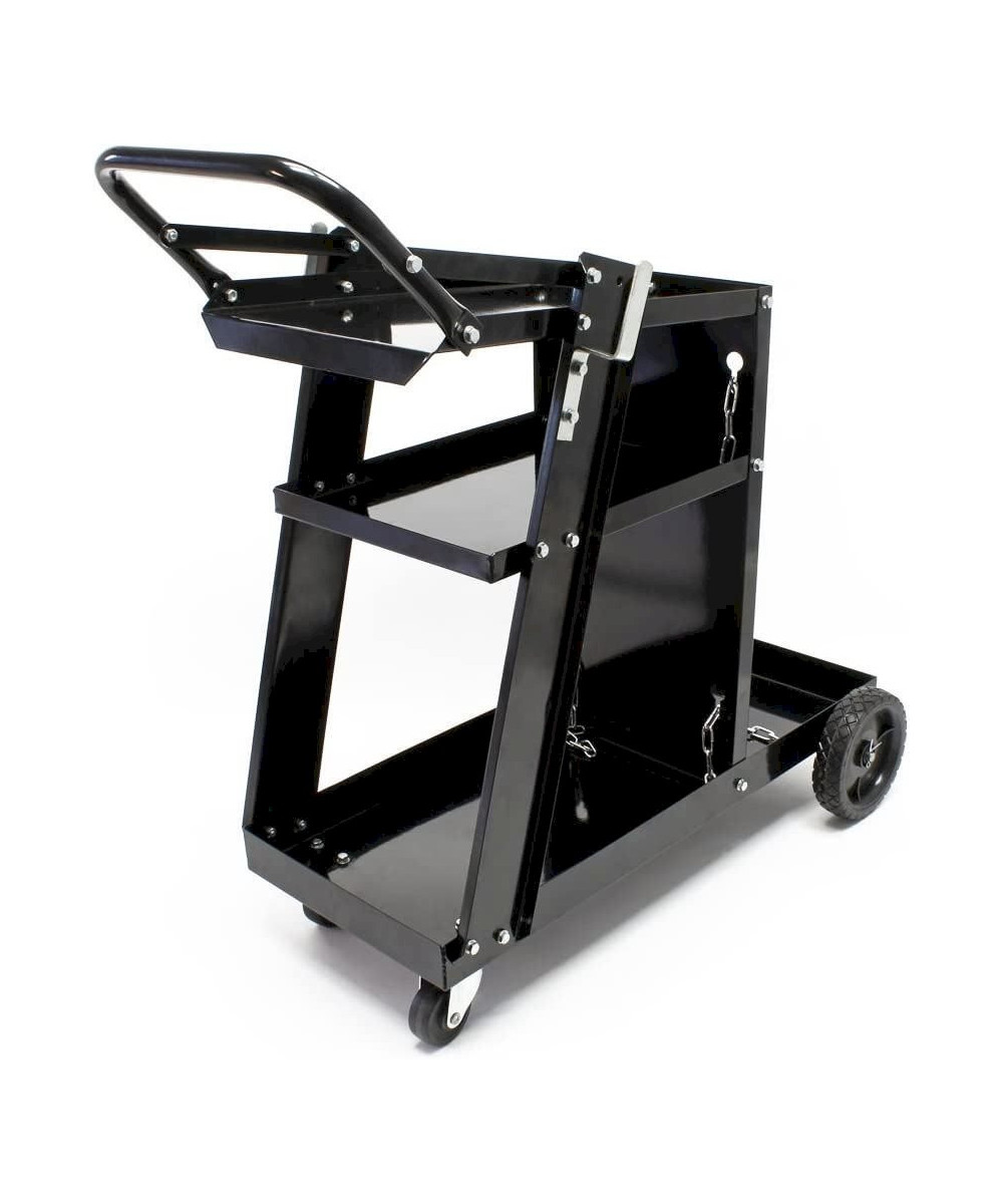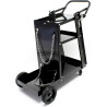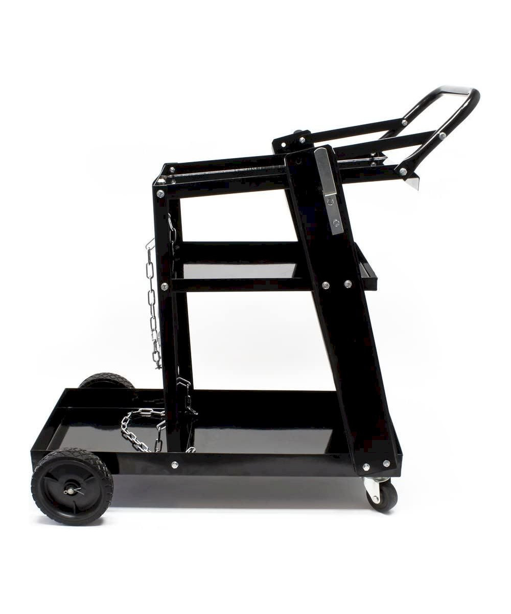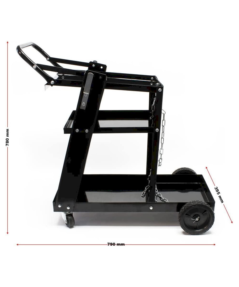 Der Wagen ist auf 3 Ebenen aufgebaut, wobei die obere leicht geneigt ist, um eine ideale Handhabung und einfache Kontrolle der Schweißschritte zu ermöglichen. Die beiden anderen Ablagen bieten ausreichend Platz für Zubehör und Elektroden, Kabel sowie diverse Kleinteile. Der Flaschenhalter ist mit zwei verstellbaren Sicherheitsketten ausgestattet. Damit Sie Ihre Arbeit gut und ordentlich erledigen können, sind auf beiden Seiten des Wagens zwei Haken vorgesehen, um die Kabel dort zu platzieren und zu verhindern, dass Sie darüber stolpern.