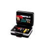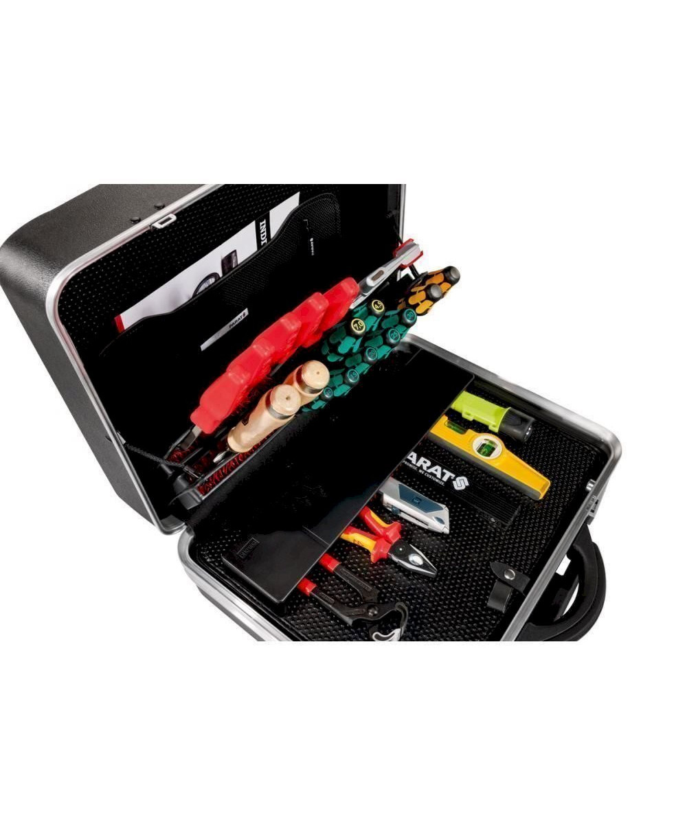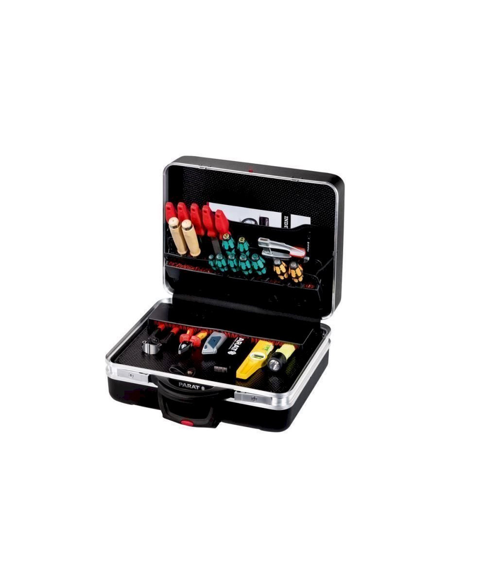 Produktbeschreibung Der CLASSIC KingSize Roll CP-7 von PARAT überzeugt vor allem durch sein enorm großes Innenraumvolumen von ca. 35 Litern und dem integrierten Leichtlaufrollensystem mit Teleskopauszugsgriff. Dabei ist der Innenraum äußerst durchdacht gestaltet: Bis zu 60 Werkzeuge finden in den intelligenten CP-7 Werkzeugtafeln aus hochwertigem Con-Pearl® Material Platz. Eine 88 mm tiefe. frei unterteilbare Bodenschale hält Kleinteile oder sperriges Werkzeug sicher verstaut. Im Deckel integriert ist ein Dokumentenfach mit zwei Visitenkartenfächern und zwei Stiftschlaufen. Dank des großen Raumangebots. der hochwertigen CP-7 Werkzeugtafeln und des Rollensystems ist der CLASSIC KingSize Roll CP-7 ideal geeignet um enorm viele Werkzeuge übersichtlich aufzunehmen und komfortabel von A nach B zu transportieren. Zum leichteren Transport verfügt der Werkzeugkoffer über leichtgängige gummierte und kugelgelagerte Laufrollen und ein Teleskopgriff-System. Der Koffer ist mit Kippzylinderschlösser sicher verschließbar. Der CLASSIC KingSize Roll CP-7 ist ideal für größere Außeneinsätze geeignet und ist aufgrund des hohen Innenraumvolumens der ideale Begleiter für alle Servicemitarbeiter. welche auf eine große Anzahl an Werkzeugen für ihre Arbeit zugreifen müssen.