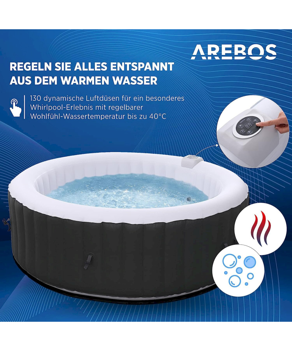Ob eine Abkühlung am heißen Sommertag oder ein angenehm, warmes Bad im Winter, der aufblasbare Whirlpool von Arebos garantiert ein entspannendes Massageerlebnis im Freien. In dem selbstaufblasenden Whirlpool können bis zu 6 Personen (4 Erwachsene + 2 Kinder) bequem eine entspannende Massage genießen. Um dies zu garantieren, ist der Pool mit 130 Luftsprudel-Massagedüsen ausgestattet und kann das Wasser auf maximal 42 °C erwärmen. Eine Auswahl an verschiedenen Whirlpool Zubehör wie Ersatz-Filter, ein Getränkehalter, oder ein Nackenkissen können Sie separat bei uns erwerben.