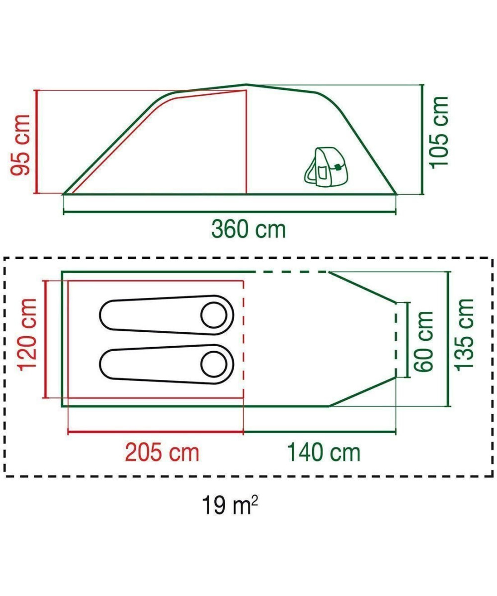2-Personen · Aufbaubreite 135 Cm · Aufbaulänge 360 Cm · Wassersäule Außenzelt 2.000 Mm · 3,5 Kg
