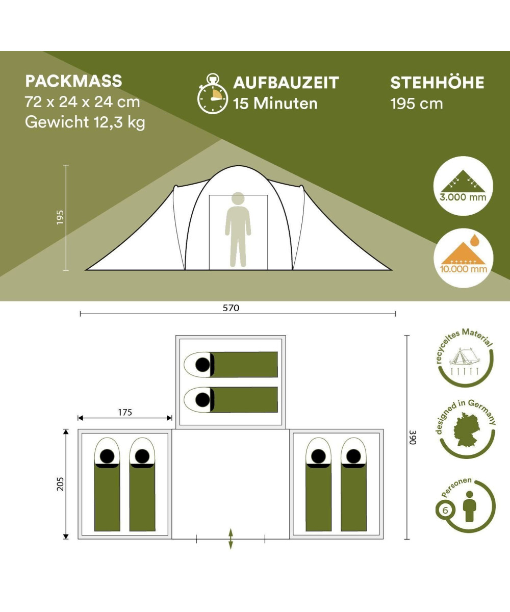 - Material (Außenzelt): 100% Polyester 185T, PU beschichtet