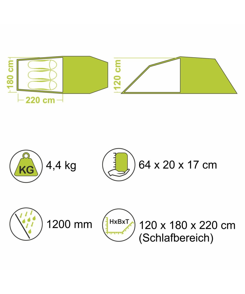 Wassersäule: 1000 mm (Zelthaut), 3000 mm (Zeltboden)