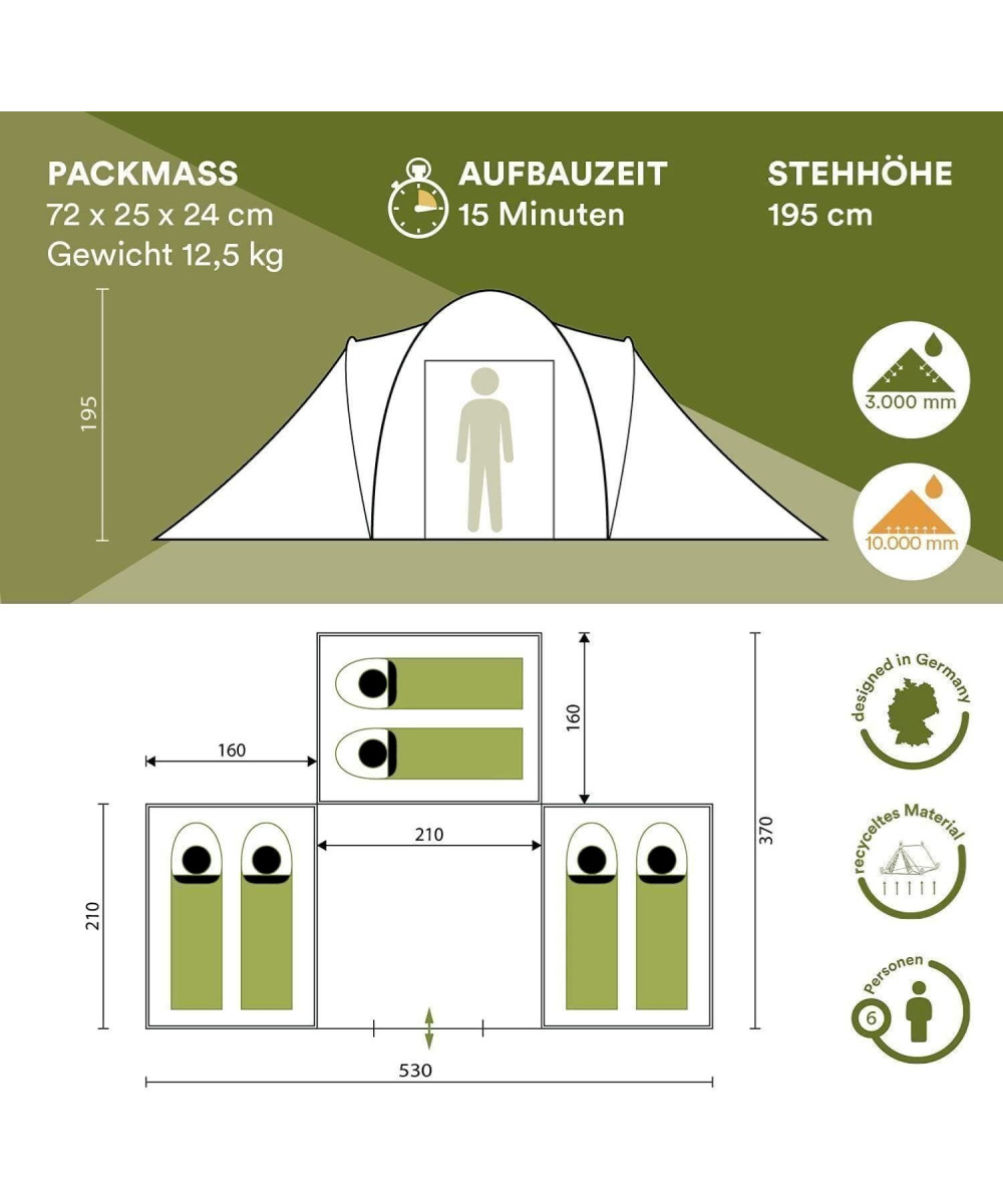 - WEITERES Das gesamte Zelt ist 530 x 370 cm groß mit einer bequemen Stehhöhe von 195 cm. Komplettes Zubehör einschließlich Zeltboden, Tragetasche, Erdnägel, Aufbauanleitung und Reparaturkit sind enthalten.