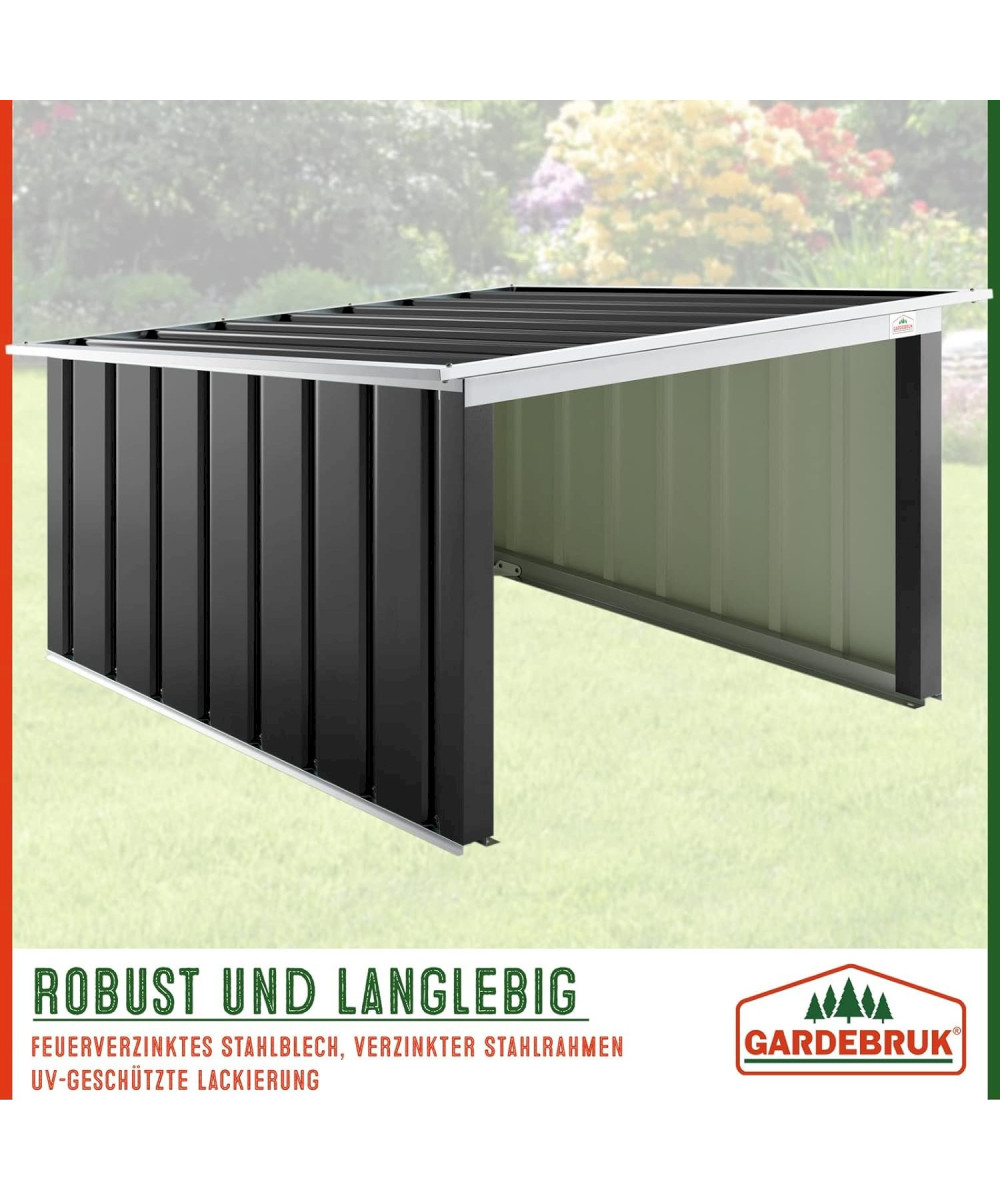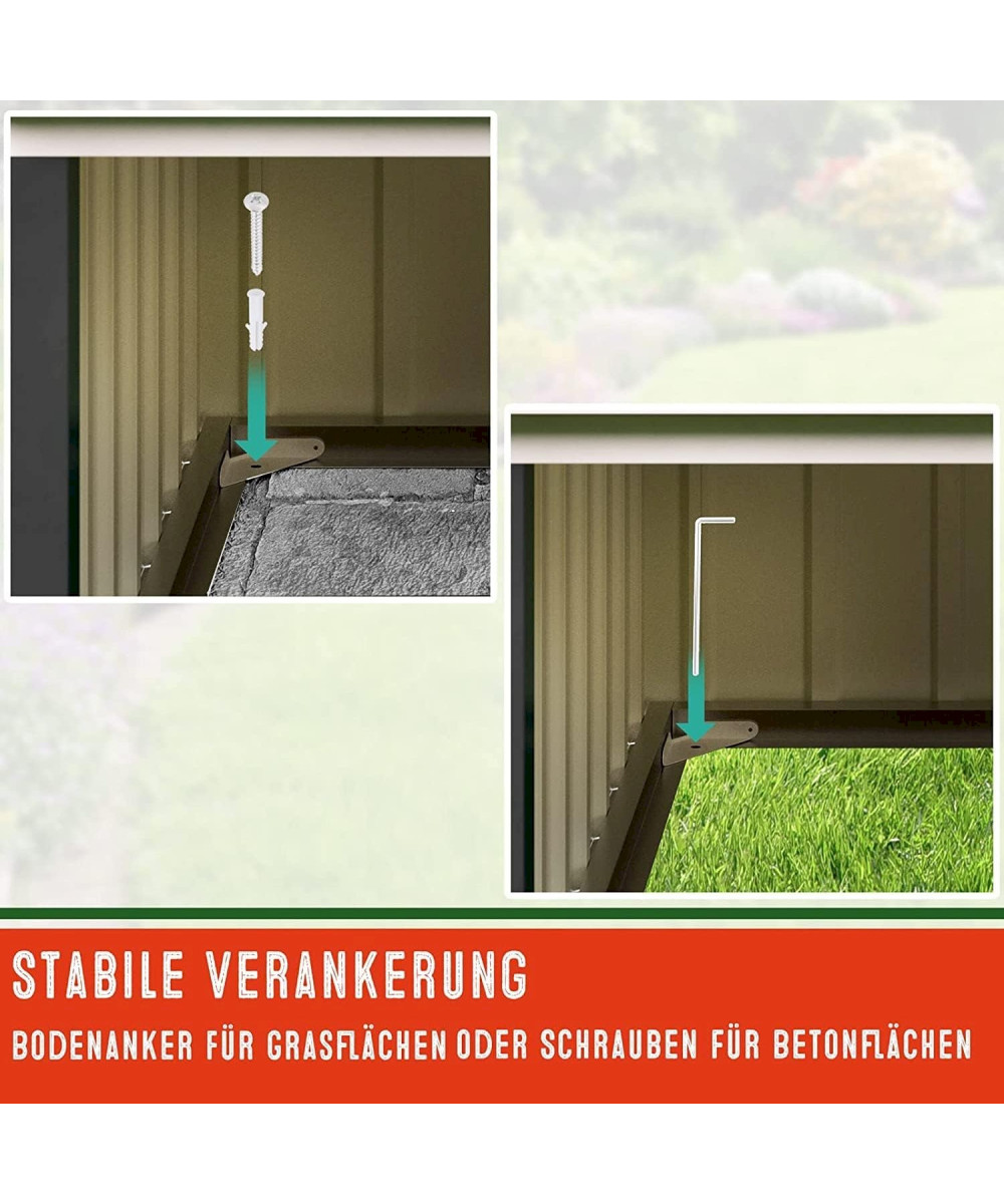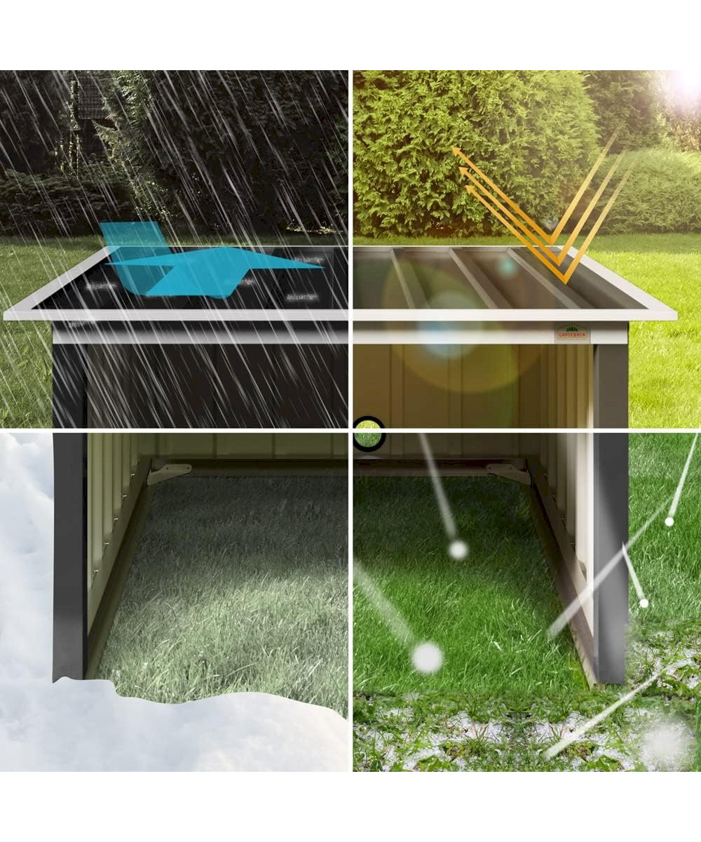 Die Trapez-Form der Metallplatten sorgt für eine optimale Wandstabilität. Zusätzliche Bodenleisten, Metallwinkel und 4 massive Erdnägel erhöhen die Stabilität und schützen die Garage vor Sturmwind. Durch die hochwertige Verzinkung ist der Unterstand äußerst resistent gegen Kälte und Rost.